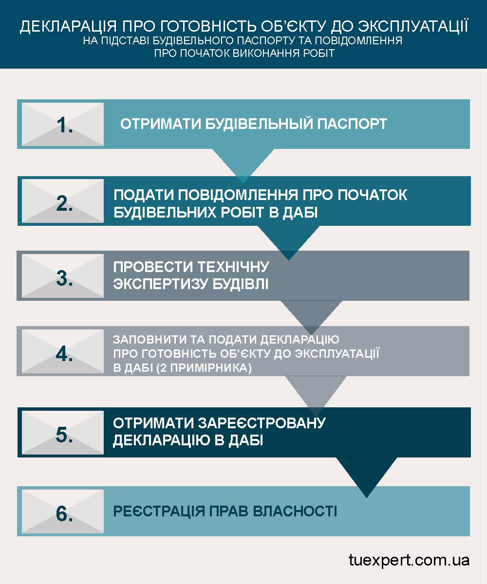 Заключающим етапам будівництва є процедура введення архітектурного об'єкта в експлуатацію та реєстрації дозвільної документації - декларації про готовність до експлуатації.